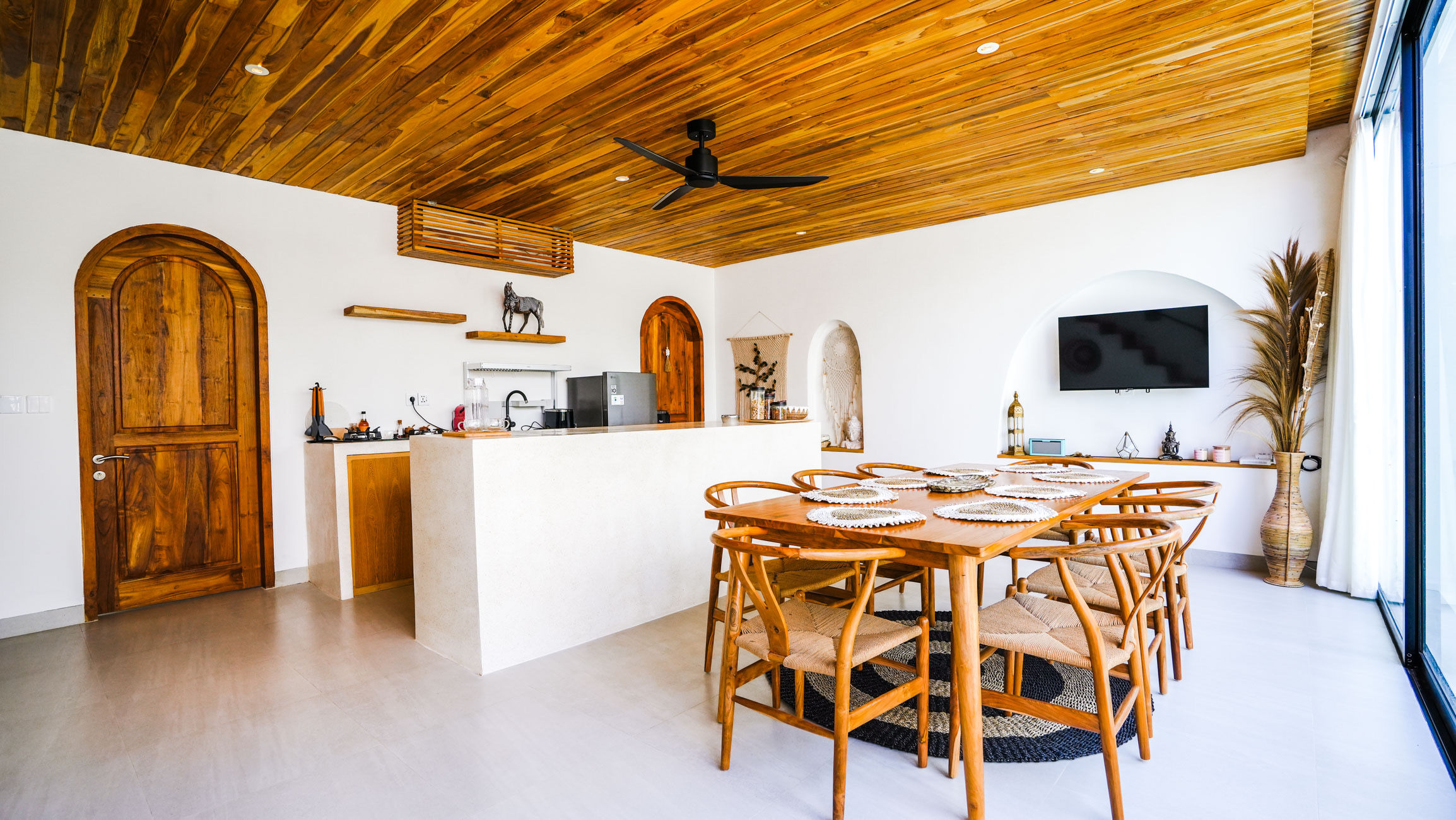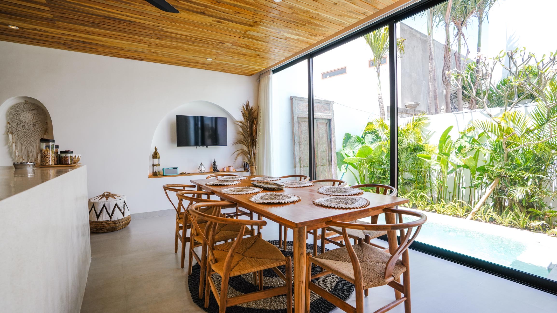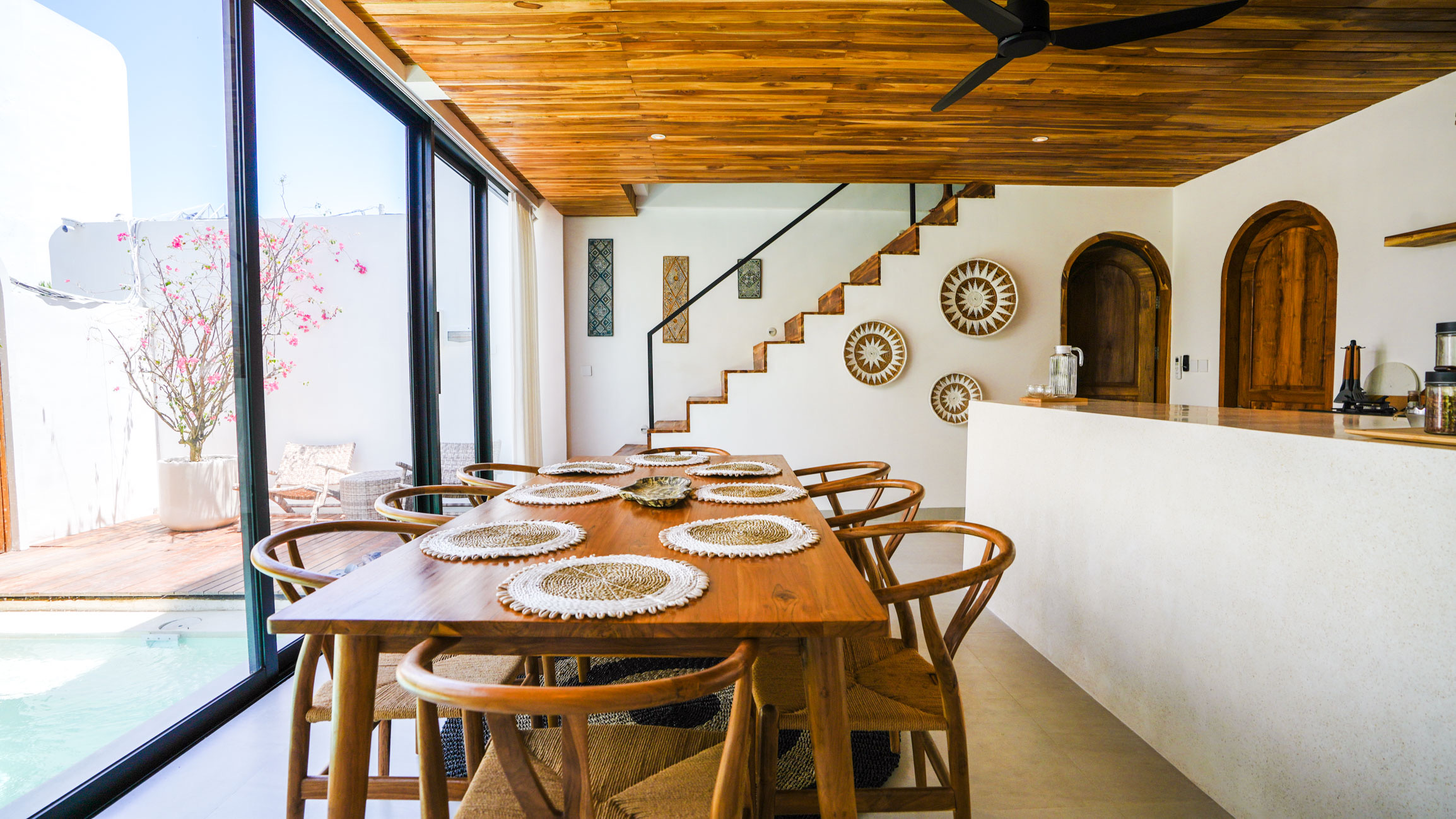 The heart of the villa is its open dining area, featuring a sleek counter kitchen.