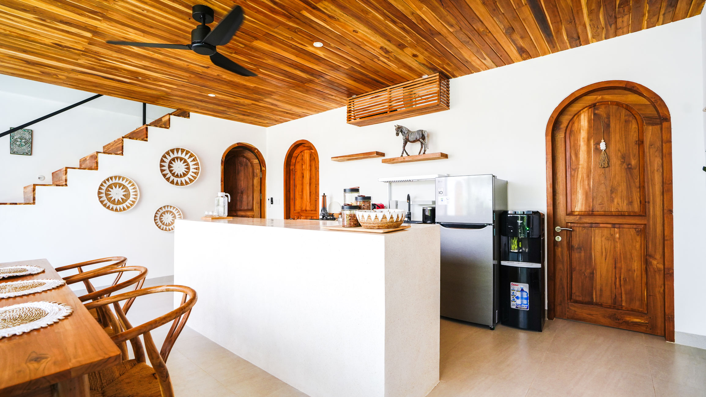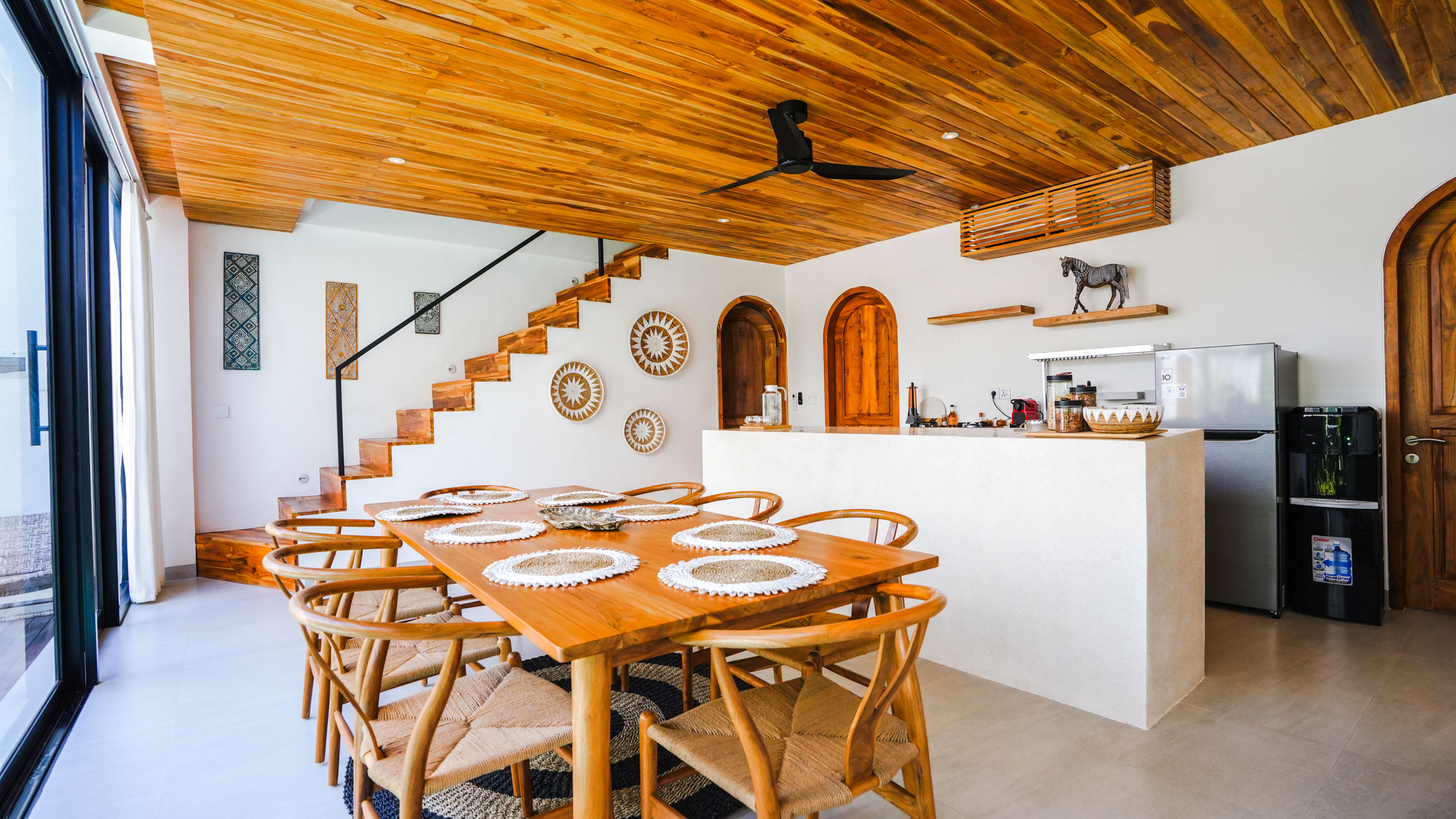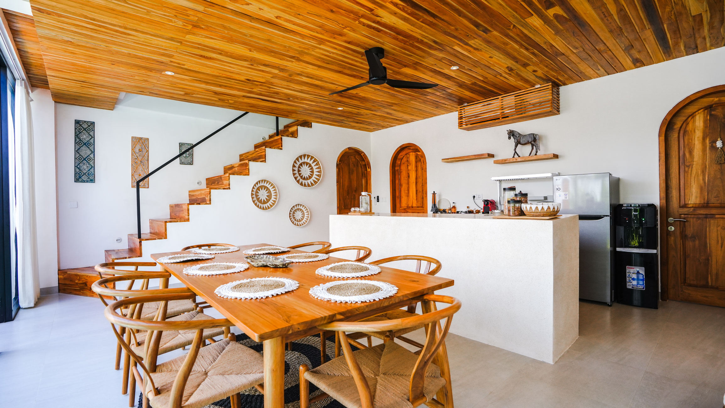 The heart of the villa is its open dining area, featuring a sleek counter kitchen.
